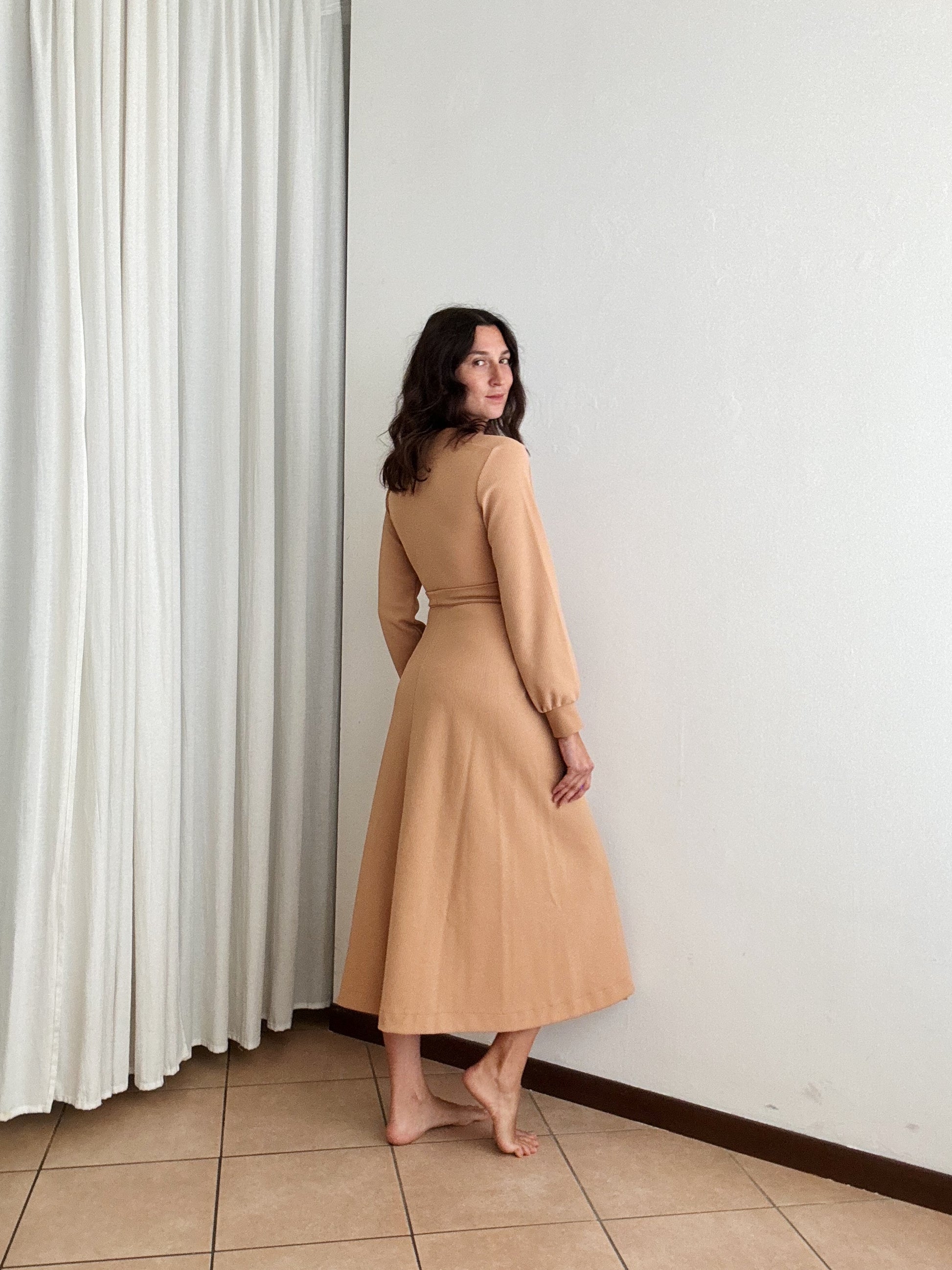 Vestaglia vintage color beige con cintura in vita. Veste fino a una taglia M. Si allaccia a portafoglio quindi in vita si regola. Misure: ascelle 44, lunghezza 124